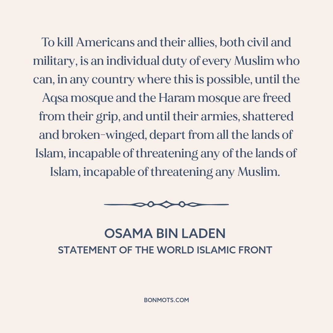 To kill Americans and their allies, both civil and military, is an individual duty of every Muslim who can, in any country where this is possible, until the Aqsa mosque and the Haram mosque are freed from their grip, and until their armies, shattered and broken-winged, depart from all the lands of Islam, incapable of threatening any of the lands of Islam, incapable of threatening any Muslim.