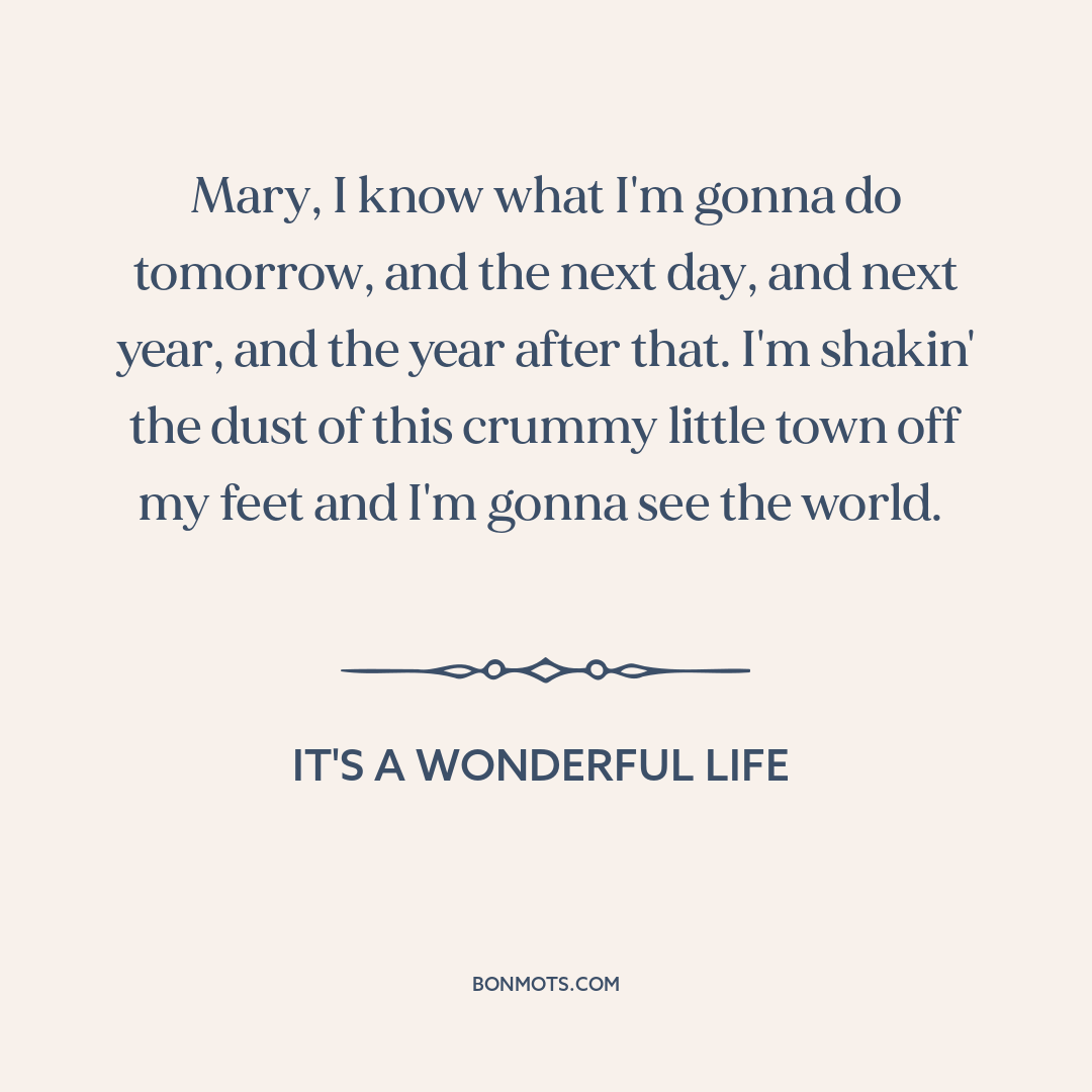 Mary, I know what I'm gonna do tomorrow, and the next day, and next year, and the year after that. I'm shakin' the dust of this crummy little town off my feet and I'm gonna see the world.
