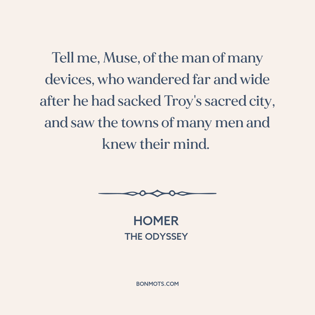 Tell me, Muse, of the man of many devices, who wandered far and wide after he had sacked Troy's sacred city, and saw the towns of many men and knew their mind.