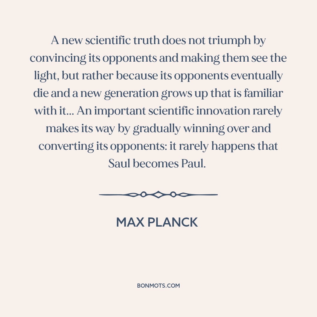 A new scientific truth does not triumph by convincing its opponents and making them see the light, but rather because its opponents eventually die and a new generation grows up that is familiar with it... An important scientific innovation rarely makes its way by gradually winning over and converting its opponents: it rarely happens that Saul becomes Paul.