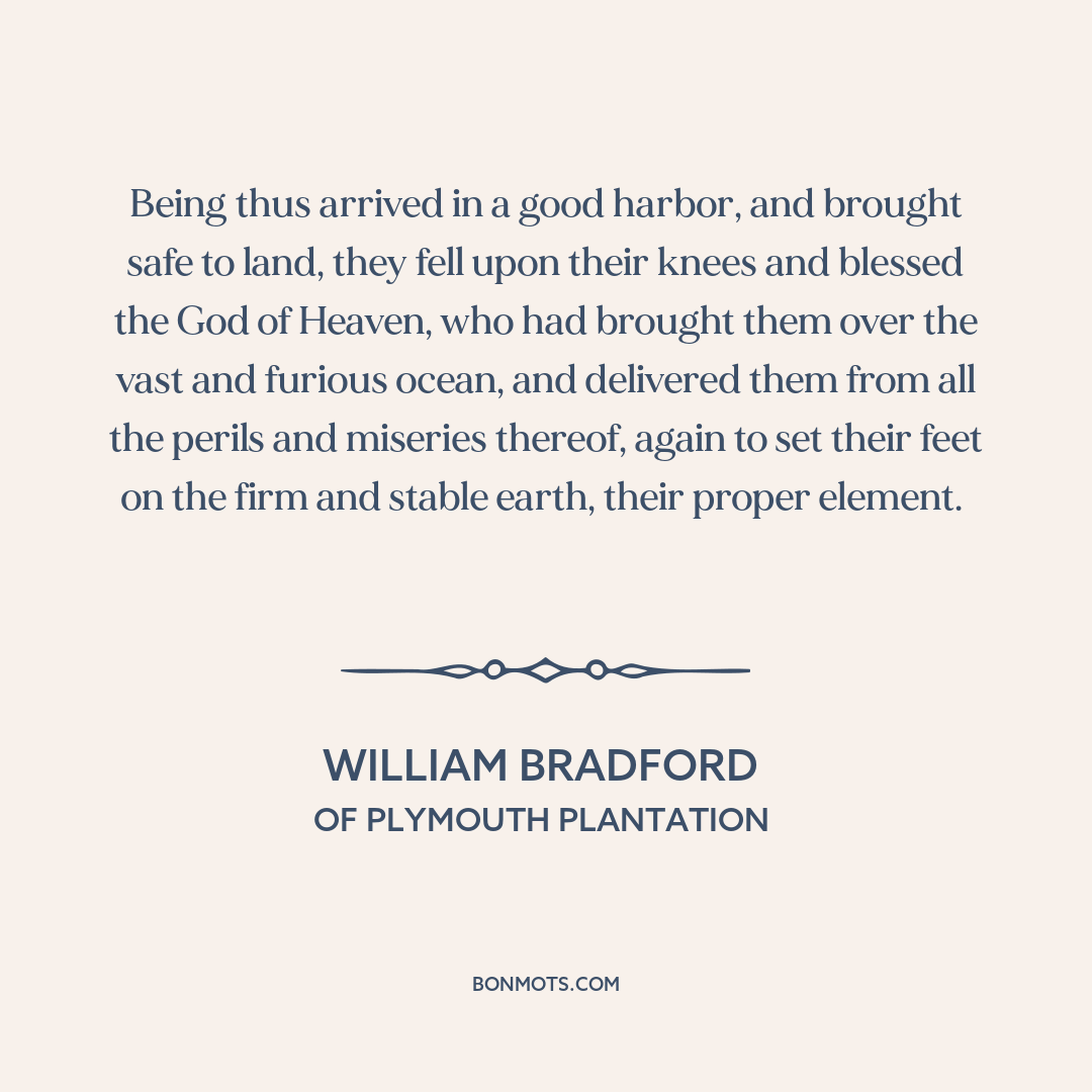 Being thus arrived in a good harbor, and brought safe to land, they fell upon their knees and blessed the God of Heaven, who had brought them over the vast and furious ocean, and delivered them from all the perils and miseries thereof, again to set their feet on the firm and stable earth, their proper element.