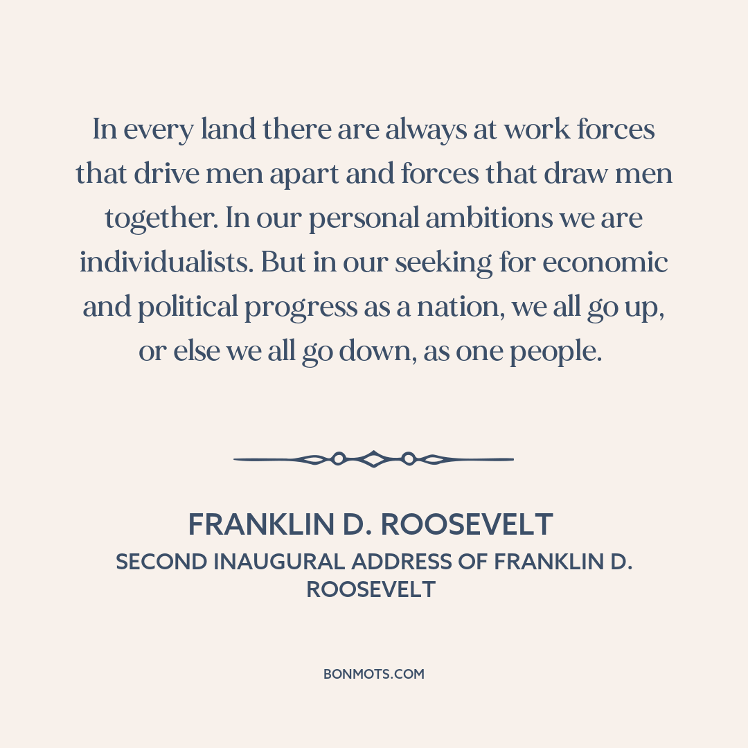 In every land there are always at work forces that drive men apart and forces that draw men together. In our personal ambitions we are individualists. But in our seeking for economic and political progress as a nation, we all go up, or else we all go down, as one people.