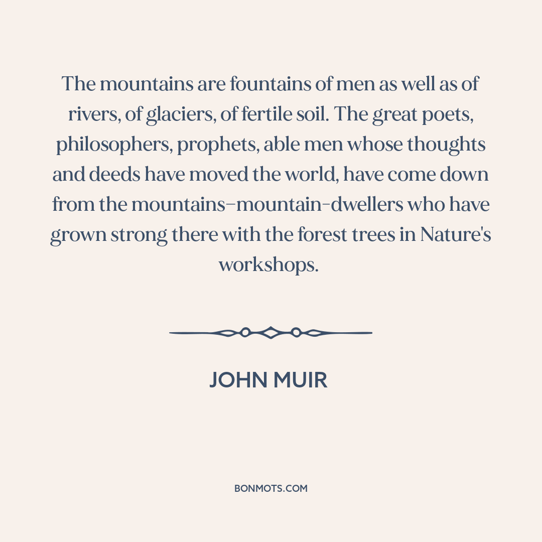 The mountains are fountains of men as well as of rivers, of glaciers, of fertile soil. The great poets, philosophers, prophets, able men whose thoughts and deeds have moved the world, have come down from the mountains—mountain-dwellers who have grown strong there with the forest trees in Nature's workshops.