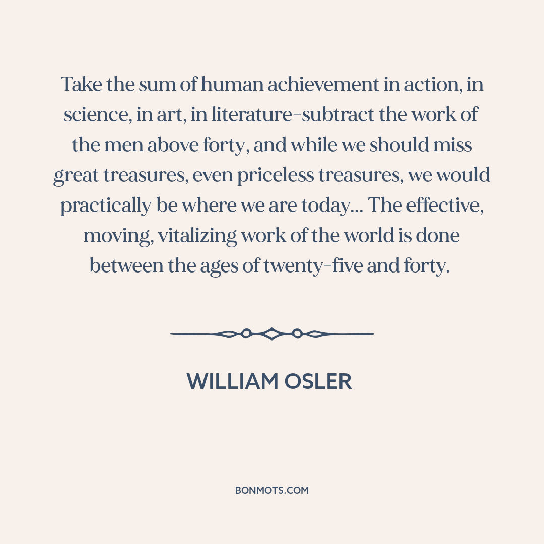 Take the sum of human achievement in action, in science, in art, in literature-subtract the work of the men above forty, and while we should miss great treasures, even priceless treasures, we would practically be where we are today... The effective, moving, vitalizing work of the world is done between the ages of twenty-five and forty.
