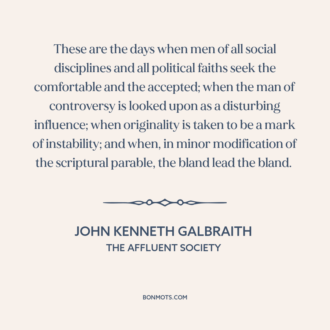 These are the days when men of all social disciplines and all political faiths seek the comfortable and the accepted; when the man of controversy is looked upon as a disturbing influence; when originality is taken to be a mark of instability; and when, in minor modification of the scriptural parable, the bland lead the bland.