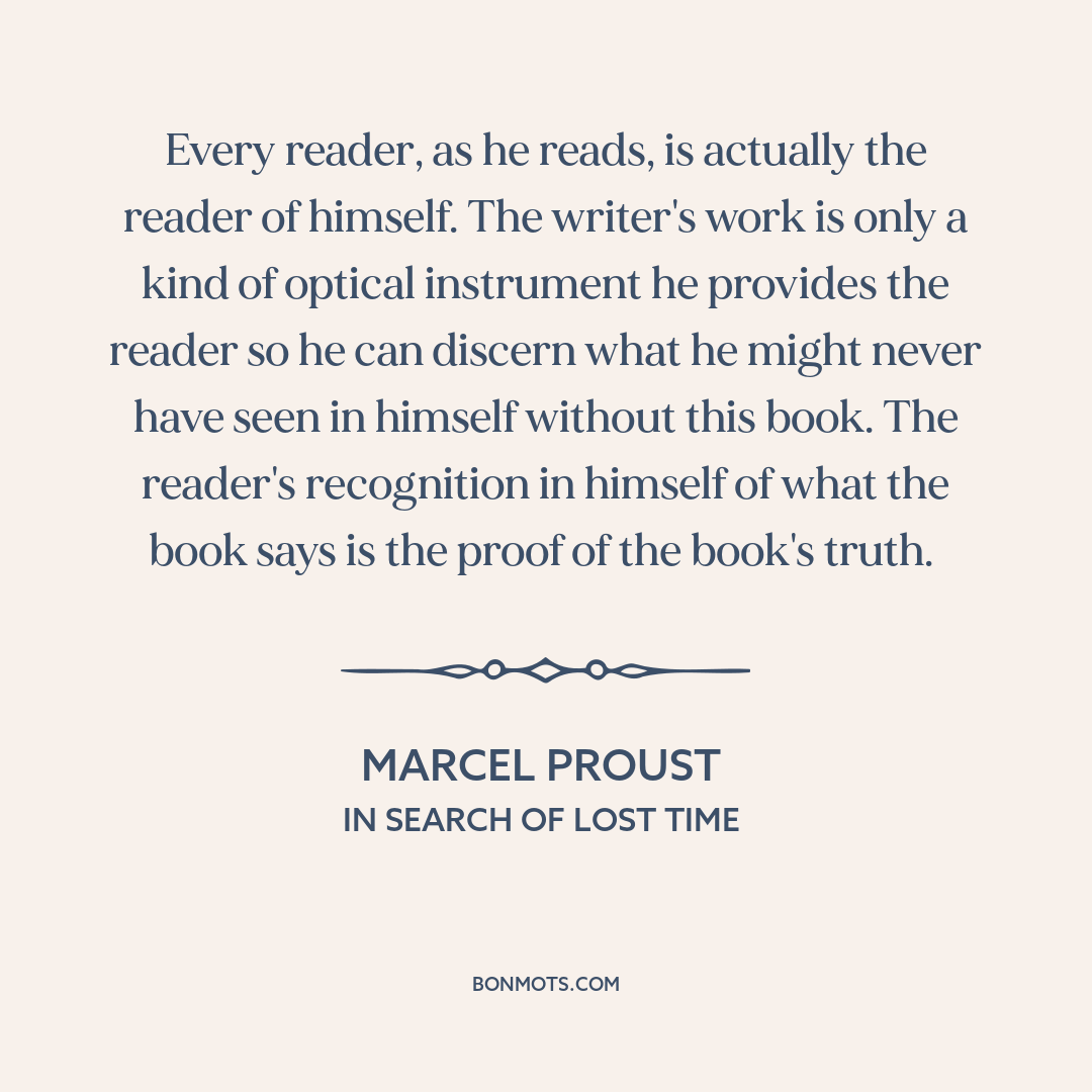 Every reader, as he reads, is actually the reader of himself. The writer's work is only a kind of optical instrument he provides the reader so he can discern what he might never have seen in himself without this book. The reader's recognition in himself of what the book says is the proof of the book's truth.