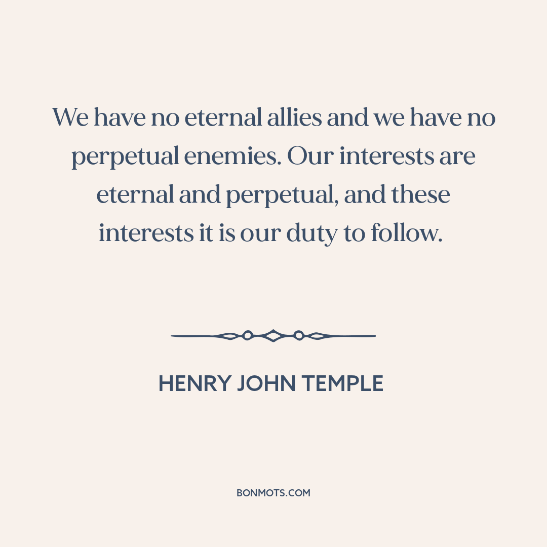 We have no eternal allies and we have no perpetual enemies. Our interests are eternal and perpetual, and these interests it is our duty to follow.