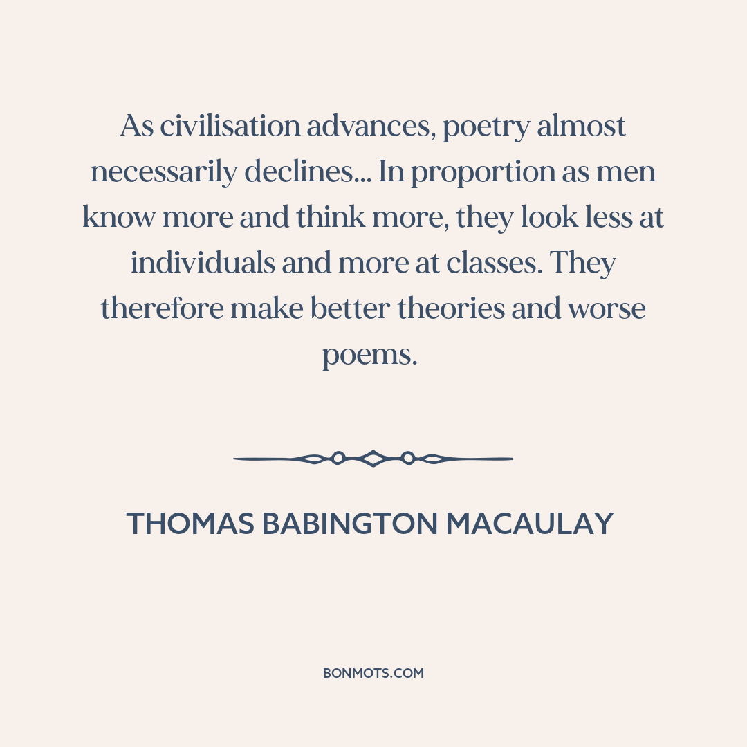 As civilisation advances, poetry almost necessarily declines... In proportion as men know more and think more, they look less at individuals and more at classes. They therefore make better theories and worse poems.