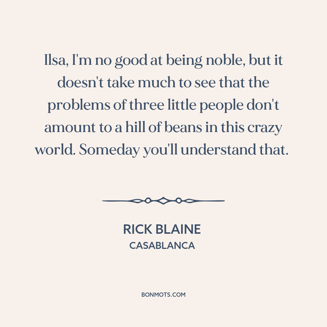 Ilsa, I'm no good at being noble, but it doesn't take much to see that the problems of three little people don't amount to a hill of beans in this crazy world. Someday you'll understand that.