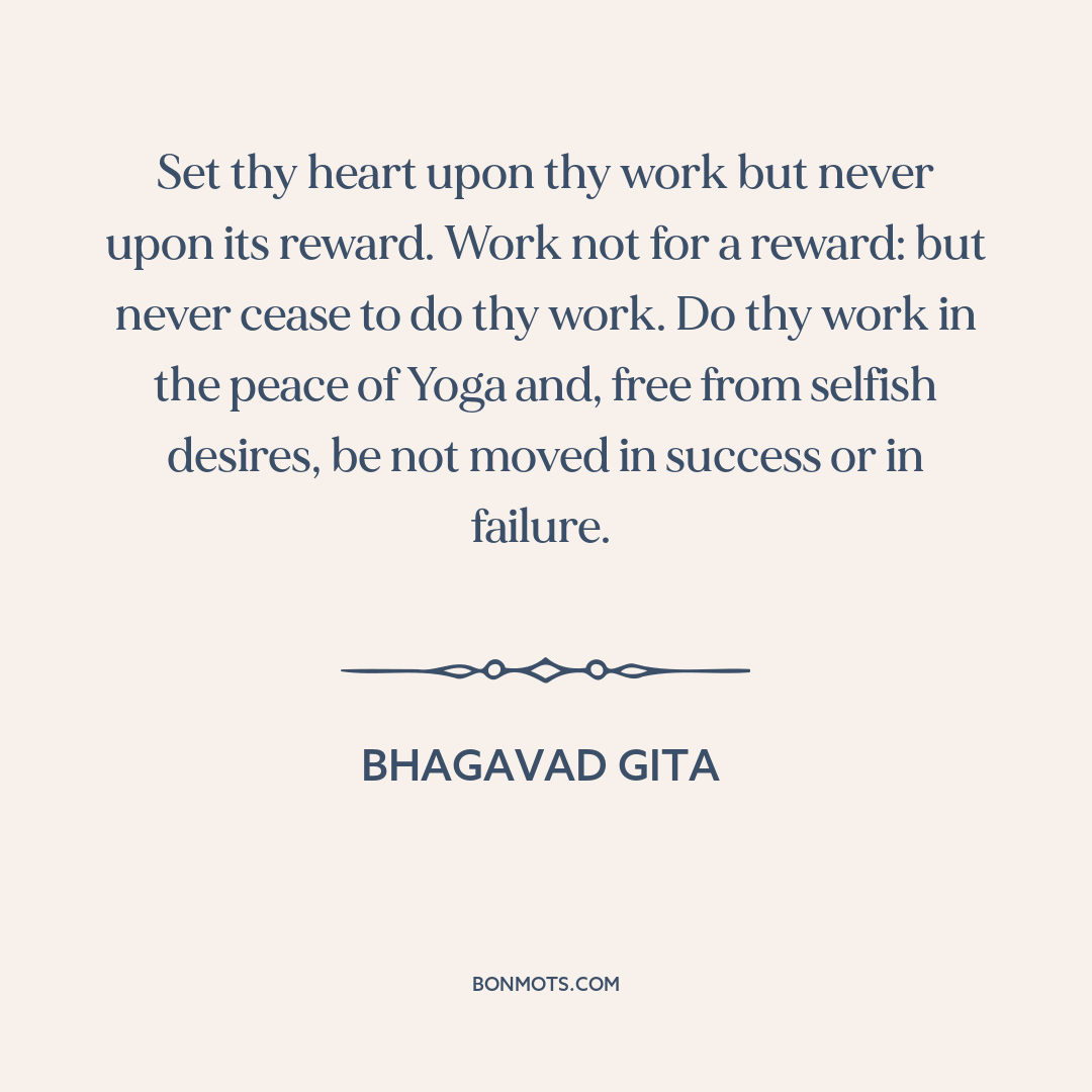 Set thy heart upon thy work but never upon its reward. Work not for a reward: but never cease to do thy work. Do thy work in the peace of Yoga and, free from selfish desires, be not moved in success or in failure.