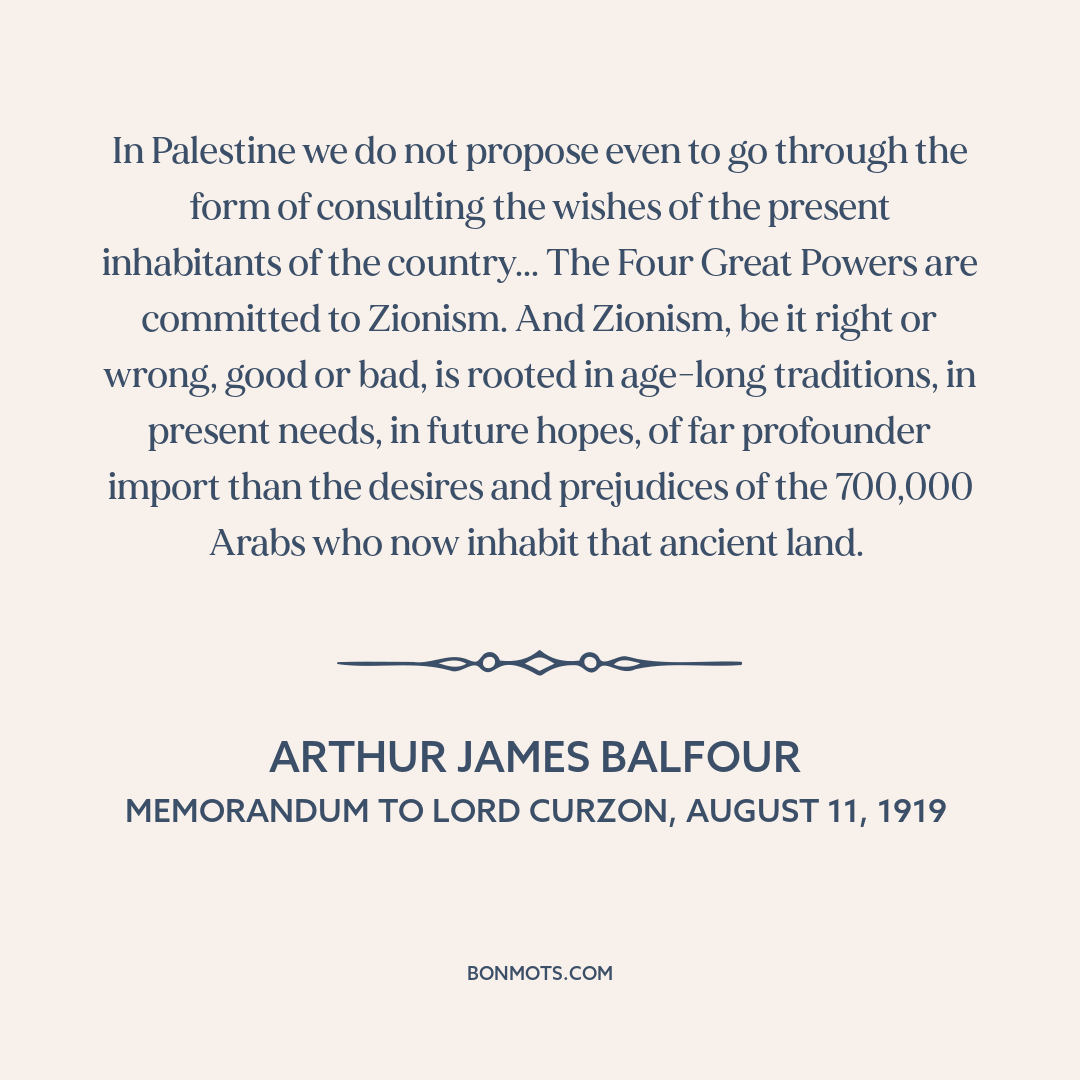 In Palestine we do not propose even to go through the form of consulting the wishes of the present inhabitants of the country... The Four Great Powers are committed to Zionism. And Zionism, be it right or wrong, good or bad, is rooted in age-long traditions, in present needs, in future hopes, of far profounder import than the desires and prejudices of the 700,000 Arabs who now inhabit that ancient land.