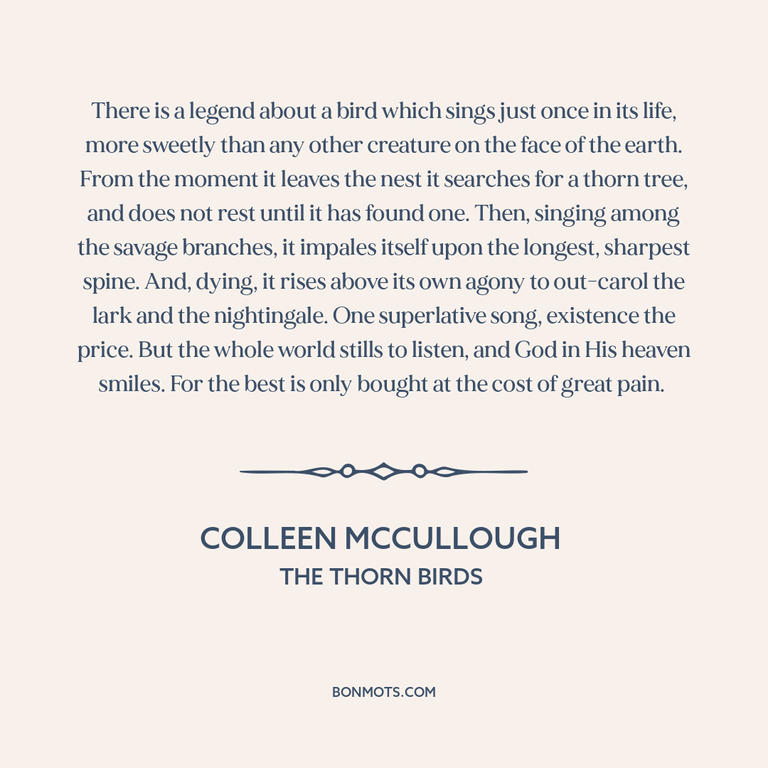 There is a legend about a bird which sings just once in its life, more sweetly than any other creature on the face of the earth. From the moment it leaves the nest it searches for a thorn tree, and does not rest until it has found one. Then, singing among the savage branches, it impales itself upon the longest, sharpest spine. And, dying, it rises above its own agony to out-carol the lark and the nightingale. One superlative song, existence the price. But the whole world stills to listen, and God in His heaven smiles. For the best is only bought at the cost of great pain.