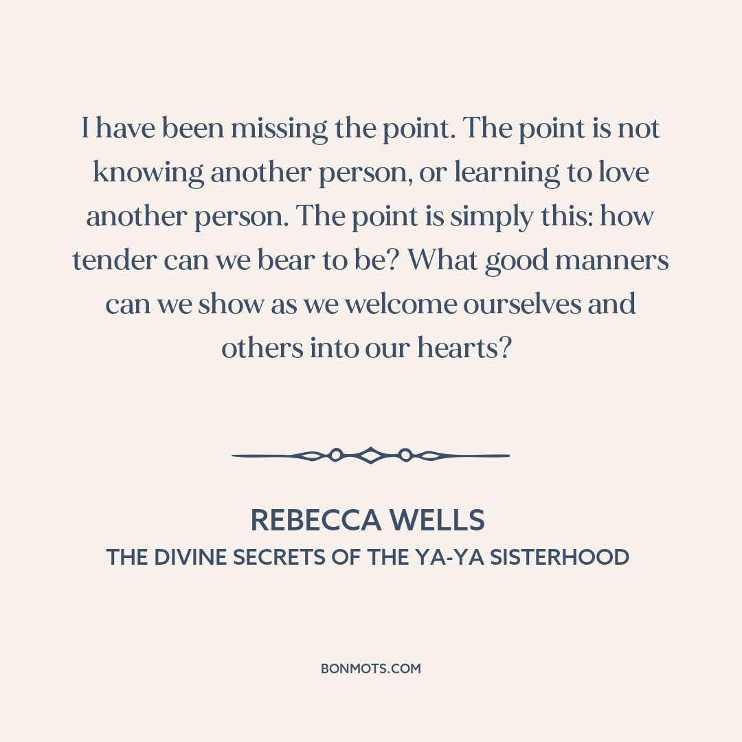 I have been missing the point. The point is not knowing another person, or learning to love another person. The point is simply this: how tender can we bear to be? What good manners can we show as we welcome ourselves and others into our hearts?