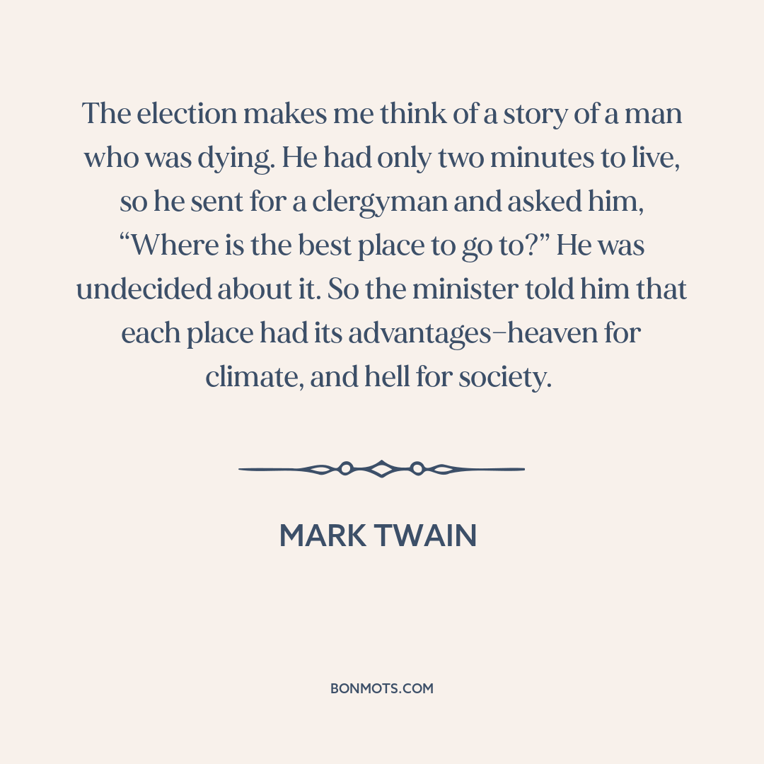 The election makes me think of a story of a man who was dying. He had only two minutes to live, so he sent for a clergyman and asked him, “Where is the best place to go to?” He was undecided about it. So the minister told him that each place had its advantages—heaven for climate, and hell for society.