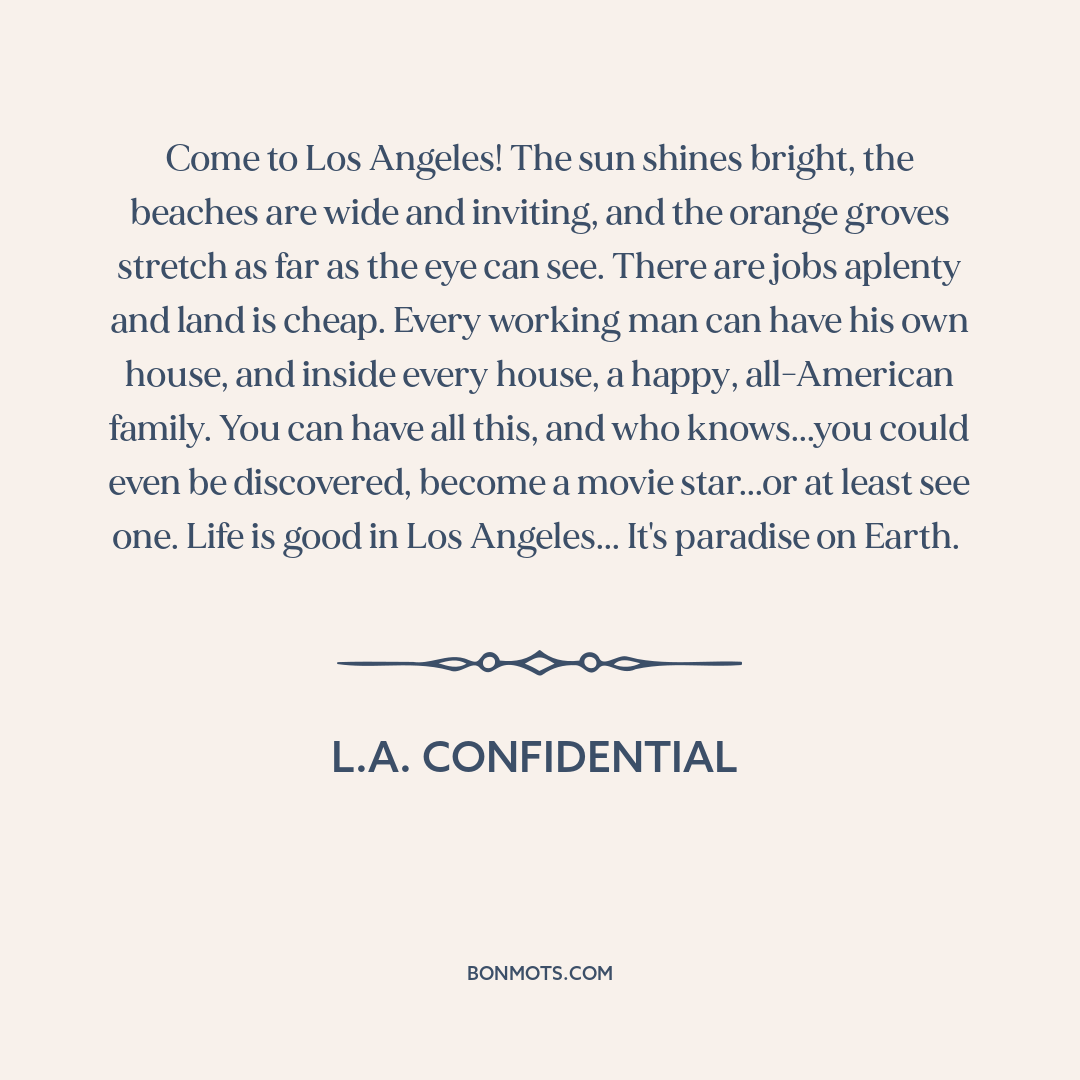 Come to Los Angeles! The sun shines bright, the beaches are wide and inviting, and the orange groves stretch as far as the eye can see. There are jobs aplenty and land is cheap. Every working man can have his own house, and inside every house, a happy, all-American family. You can have all this, and who knows...you could even be discovered, become a movie star...or at least see one. Life is good in Los Angeles... It's paradise on Earth.