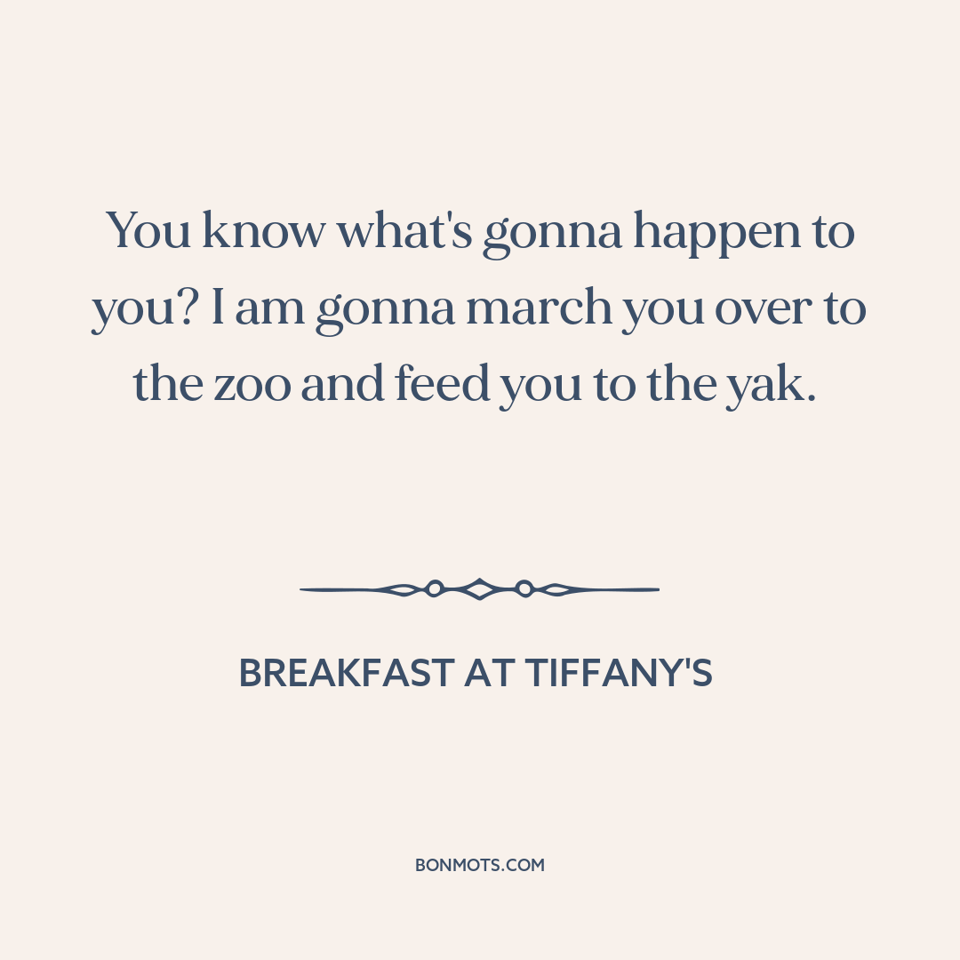 You know what's gonna happen to you? I am gonna march you over to the zoo and feed you to the yak.