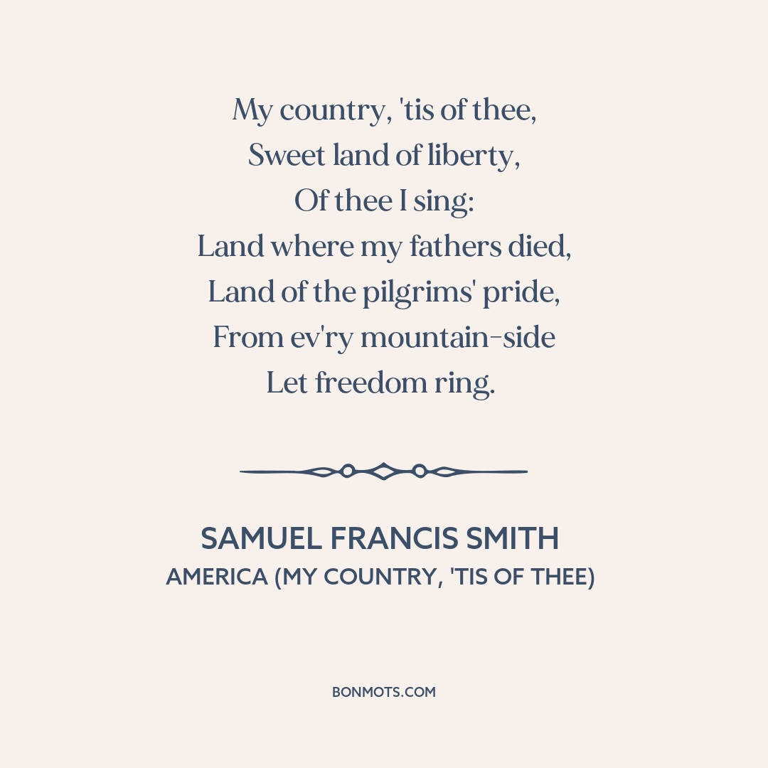 Smith, Samuel Francis. "America." The Choir. Boston: Lowell Mason, 1832. Originally performed in public on 4 July 1831, Park Street Church, Boston, MA, USA.