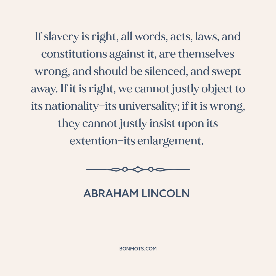 If slavery is right, all words, acts, laws, and constitutions against it, are themselves wrong, and should be silenced, and swept away. If it is right, we cannot justly object to its nationality—its universality; if it is wrong, they cannot justly insist upon its extention—its enlargement.