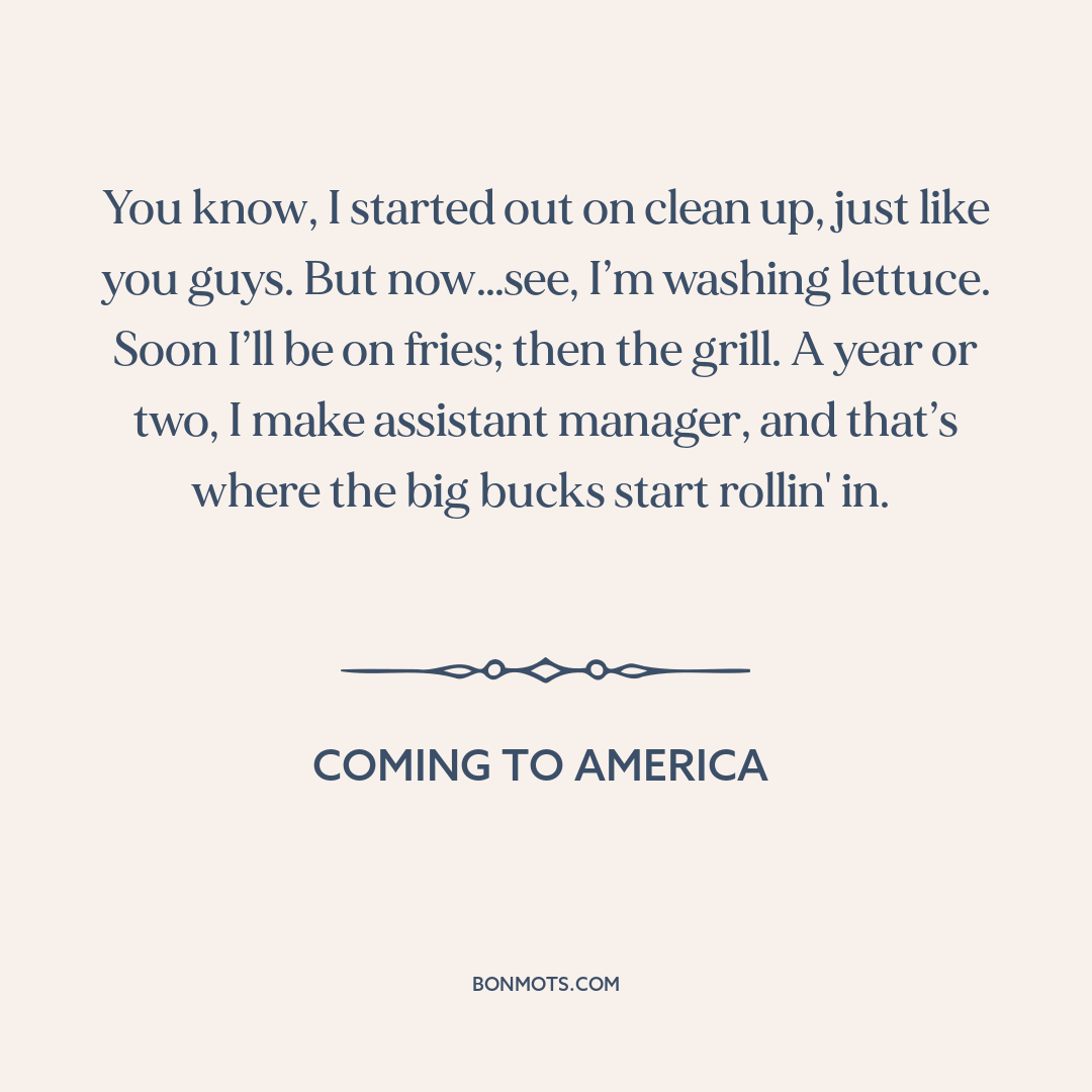 You know, I started out on clean up, just like you guys. But now…see, I’m washing lettuce. Soon I’ll be on fries; then the grill. A year or two, I make assistant manager, and that’s where the big bucks start rollin' in.