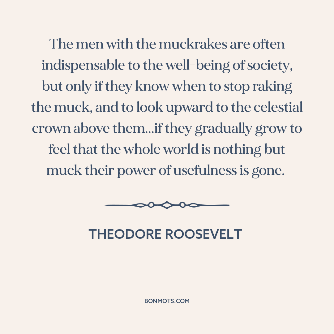 The men with the muckrakes are often indispensable to the well-being of society, but only if they know when to stop raking the muck, and to look upward to the celestial crown above them...if they gradually grow to feel that the whole world is nothing but muck their power of usefulness is gone.