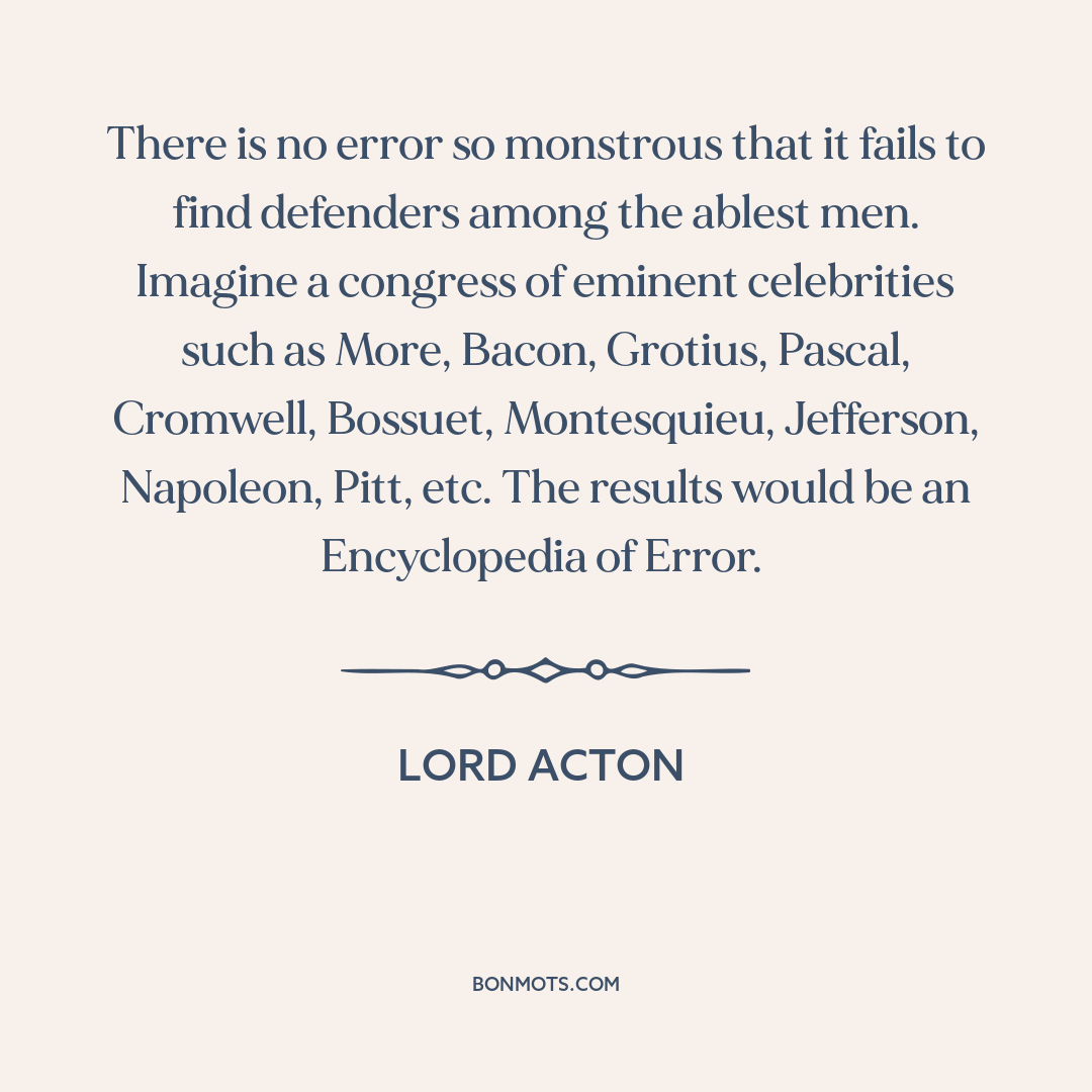 There is no error so monstrous that it fails to find defenders among the ablest men. Imagine a congress of eminent celebrities such as More, Bacon, Grotius, Pascal, Cromwell, Bossuet, Montesquieu, Jefferson, Napoleon, Pitt, etc. The results would be an Encyclopedia of Error.