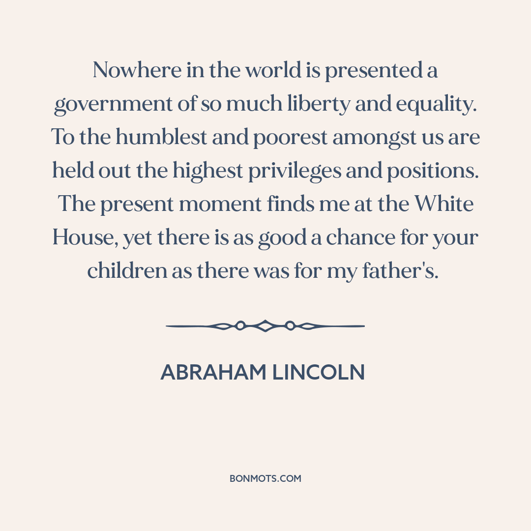 Nowhere in the world is presented a government of so much liberty and equality. To the humblest and poorest amongst us are held out the highest privileges and positions. The present moment finds me at the White House, yet there is as good a chance for your children as there was for my father's.