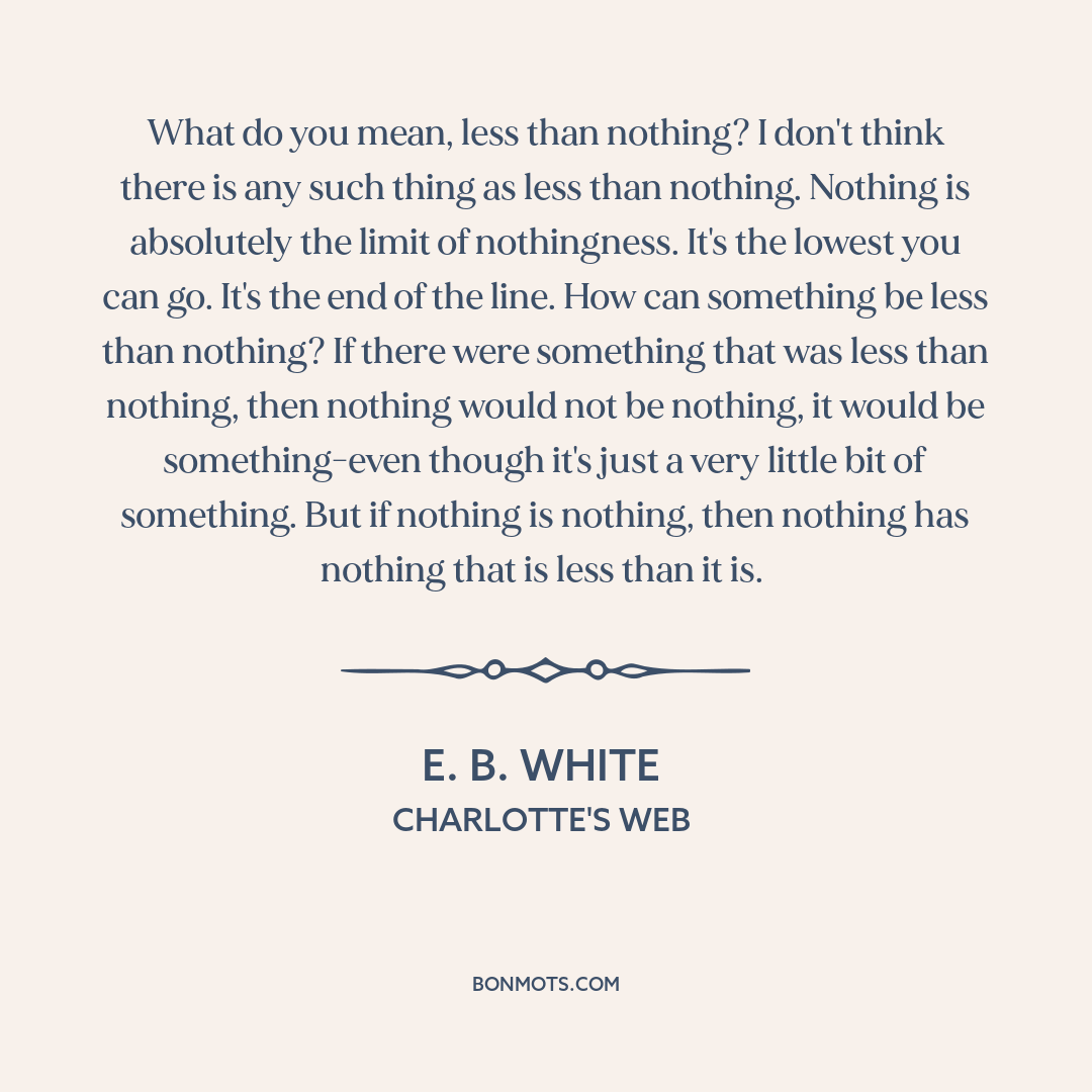 What do you mean, less than nothing? I don't think there is any such thing as less than nothing. Nothing is absolutely the limit of nothingness. It's the lowest you can go. It's the end of the line. How can something be less than nothing? If there were something that was less than nothing, then nothing would not be nothing, it would be something-even though it's just a very little bit of something. But if nothing is nothing, then nothing has nothing that is less than it is.