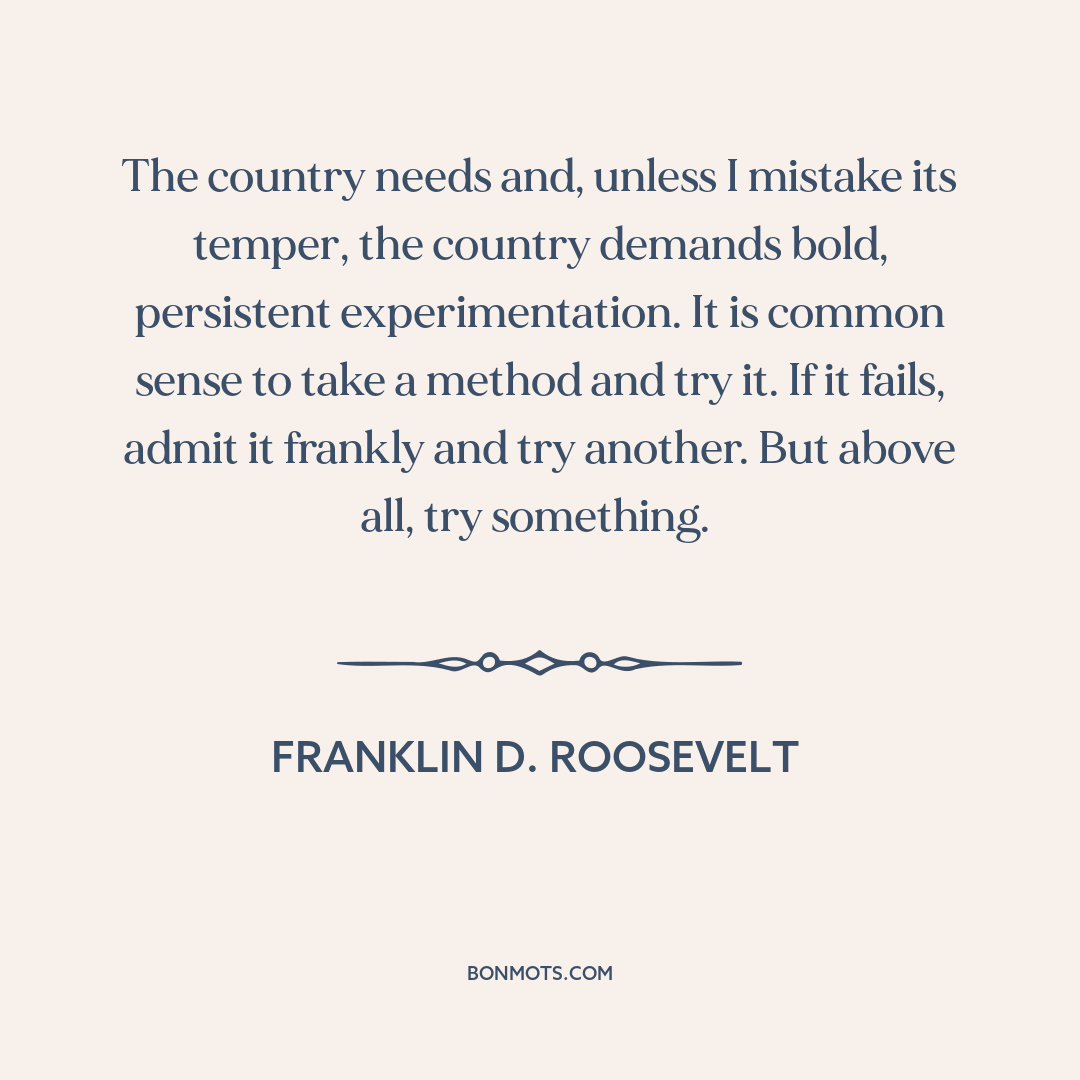 The country needs and, unless I mistake its temper, the country demands bold, persistent experimentation. It is common sense to take a method and try it. If it fails, admit it frankly and try another. But above all, try something.