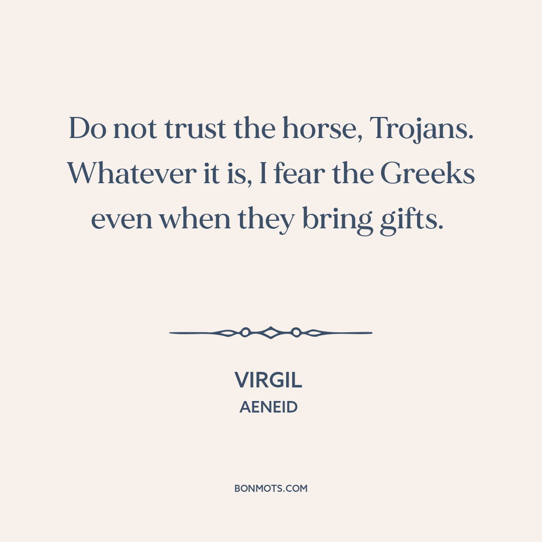 Do not trust the horse, Trojans. Whatever it is, I fear the Greeks even when they bring gifts.