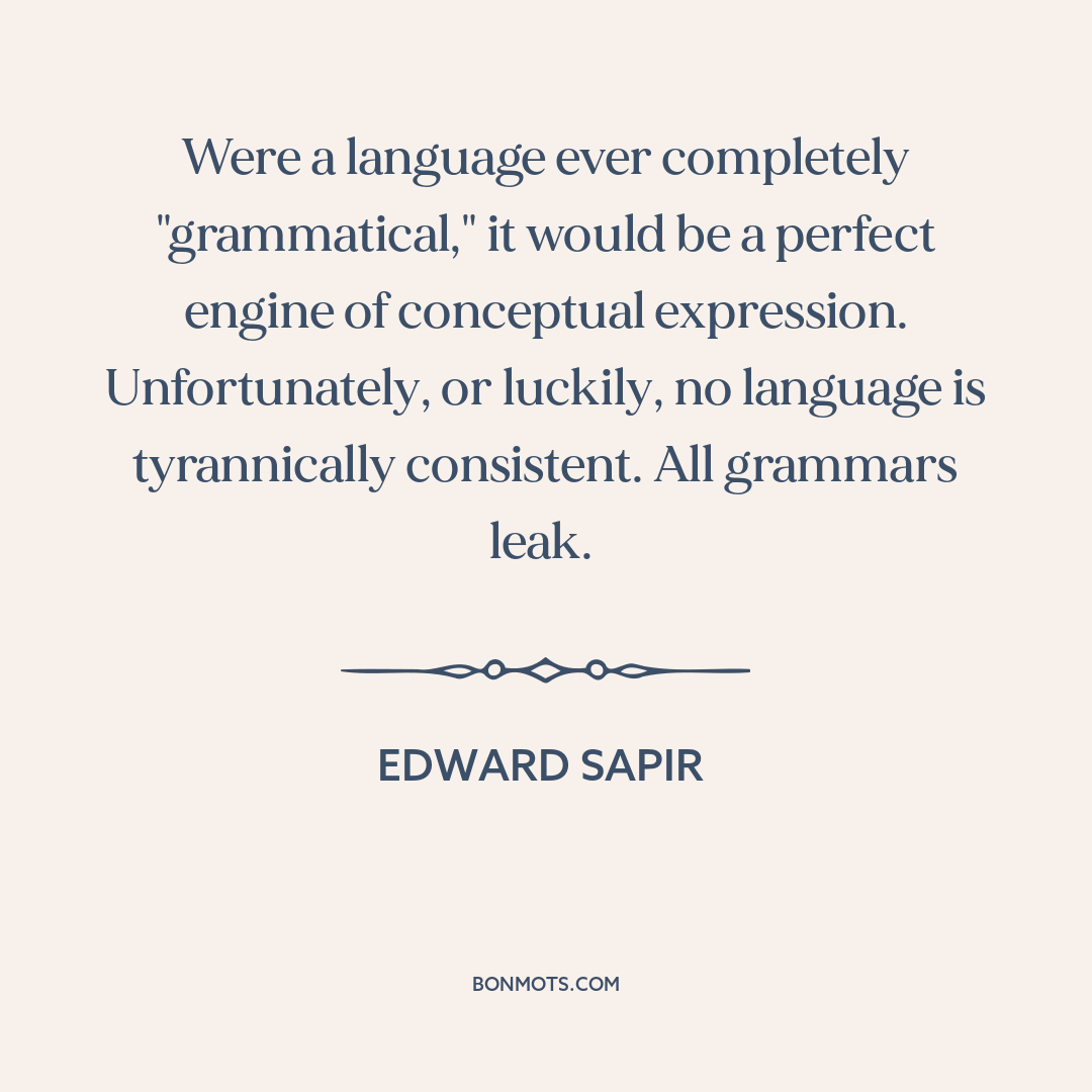 Were a language ever completely "grammatical," it would be a perfect engine of conceptual expression. Unfortunately, or luckily, no language is tyrannically consistent. All grammars leak.