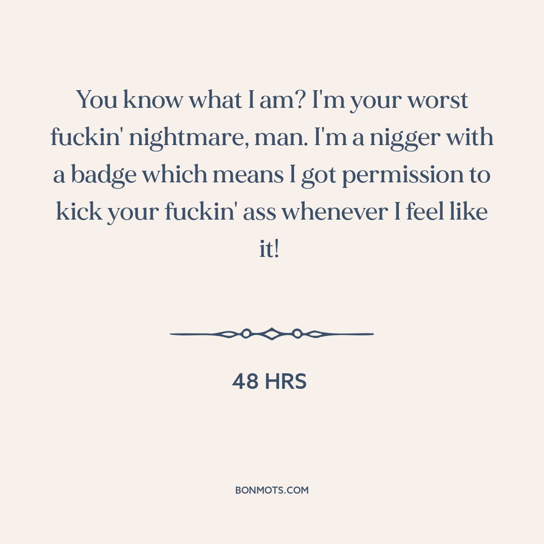 You know what I am? I'm your worst fuckin' nightmare, man. I'm a nigger with a badge which means I got permission to kick your fuckin' ass whenever I feel like it!