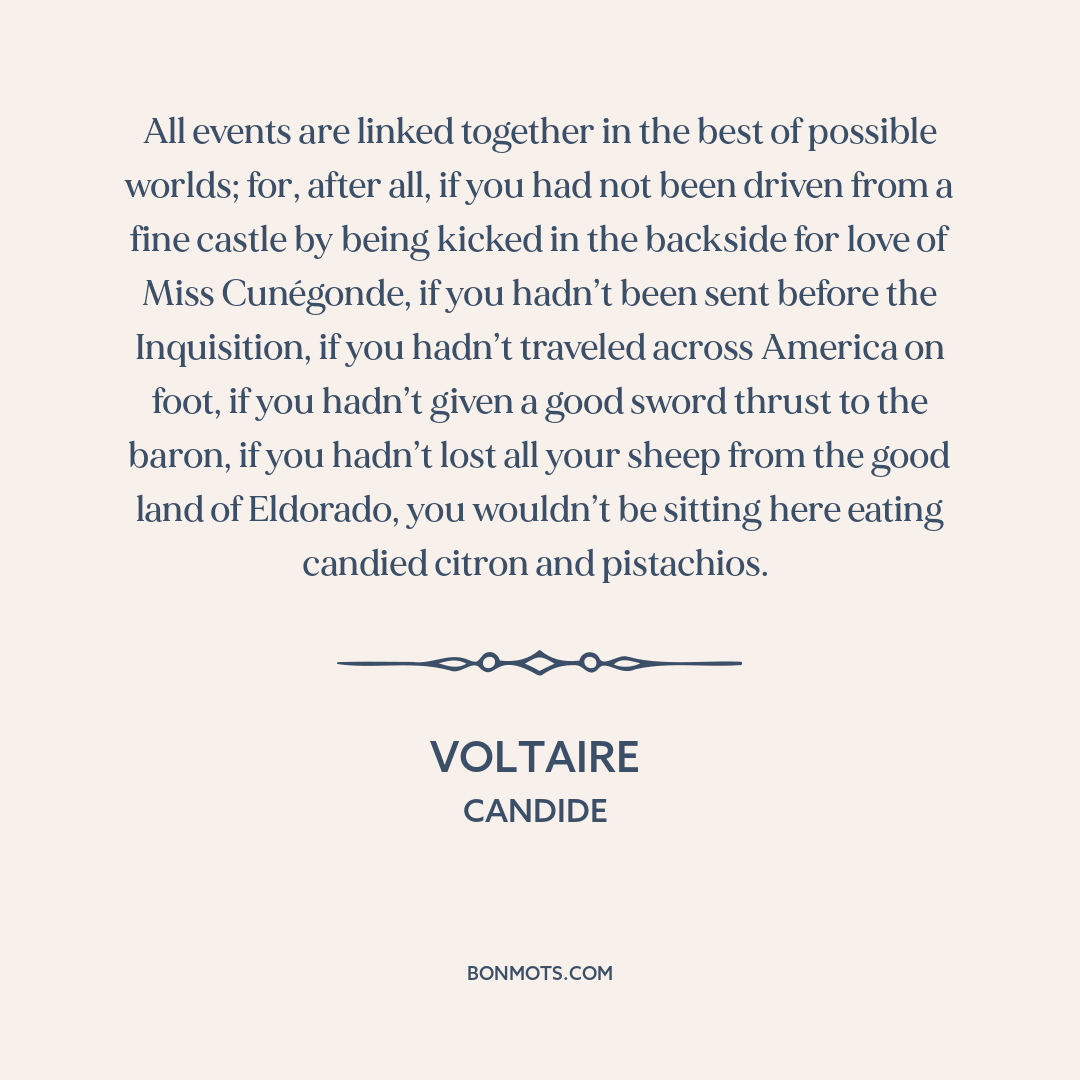 All events are linked together in the best of possible worlds; for, after all, if you had not been driven from a fine castle by being kicked in the backside for love of Miss Cunégonde, if you hadn’t been sent before the Inquisition, if you hadn’t traveled across America on foot, if you hadn’t given a good sword thrust to the baron, if you hadn’t lost all your sheep from the good land of Eldorado, you wouldn’t be sitting here eating candied citron and pistachios.