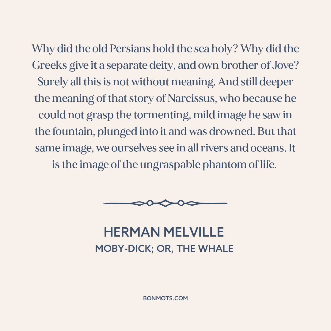 Why did the old Persians hold the sea holy? Why did the Greeks give it a separate deity, and own brother of Jove? Surely all this is not without meaning. And still deeper the meaning of that story of Narcissus, who because he could not grasp the tormenting, mild image he saw in the fountain, plunged into it and was drowned. But that same image, we ourselves see in all rivers and oceans. It is the image of the ungraspable phantom of life.