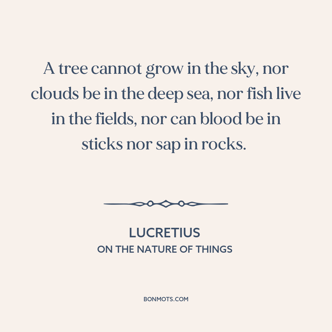A tree cannot grow in the sky, nor clouds be in the deep sea, nor fish live in the fields, nor can blood be in sticks nor sap in rocks.