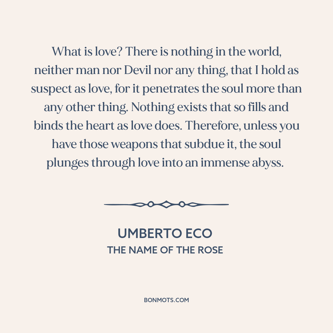 What is love? There is nothing in the world, neither man nor Devil nor any thing, that I hold as suspect as love, for it penetrates the soul more than any other thing. Nothing exists that so fills and binds the heart as love does. Therefore, unless you have those weapons that subdue it, the soul plunges through love into an immense abyss.