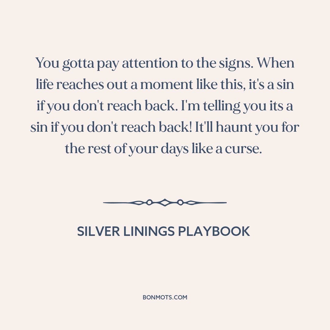 You gotta pay attention to the signs. When life reaches out a moment like this, it's a sin if you don't reach back. I'm telling you its a sin if you don't reach back! It'll haunt you for the rest of your days like a curse.