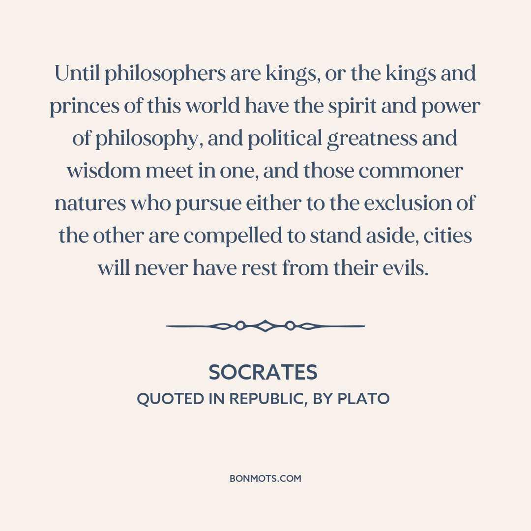 Until philosophers are kings, or the kings and princes of this world have the spirit and power of philosophy, and political greatness and wisdom meet in one, and those commoner natures who pursue either to the exclusion of the other are compelled to stand aside, cities will never have rest from their evils.