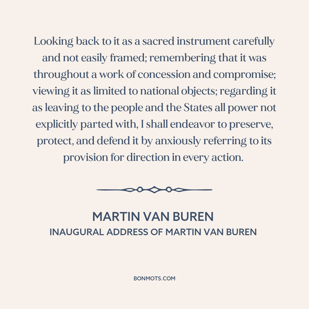 Looking back to it as a sacred instrument carefully and not easily framed; remembering that it was throughout a work of concession and compromise; viewing it as limited to national objects; regarding it as leaving to the people and the States all power not explicitly parted with, I shall endeavor to preserve, protect, and defend it by anxiously referring to its provision for direction in every action.
