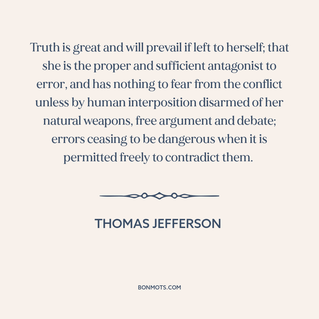 Truth is great and will prevail if left to herself; that she is the proper and sufficient antagonist to error, and has nothing to fear from the conflict unless by human interposition disarmed of her natural weapons, free argument and debate; errors ceasing to be dangerous when it is permitted freely to contradict them.