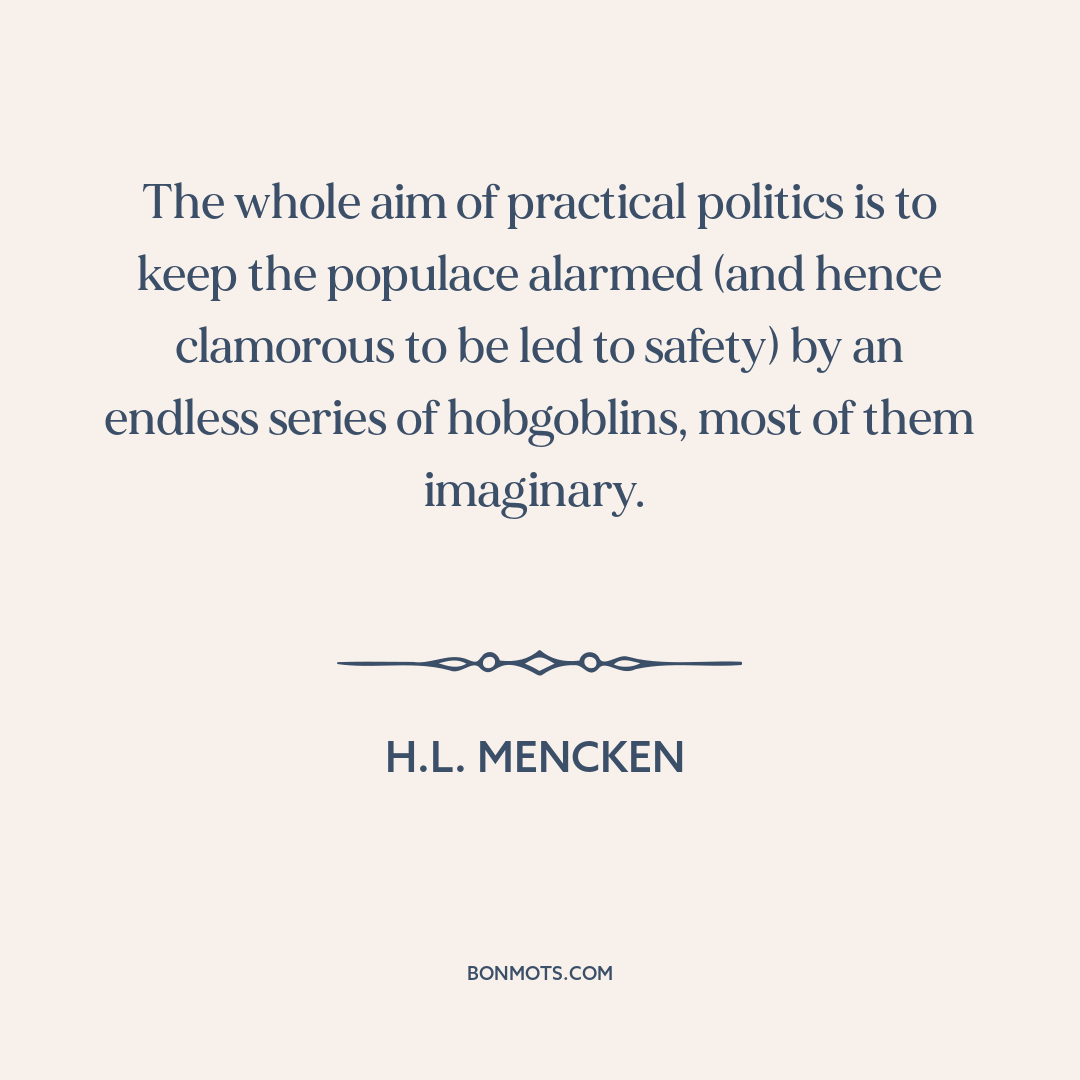 The whole aim of practical politics is to keep the populace alarmed (and hence clamorous to be led to safety) by an endless series of hobgoblins, most of them imaginary.