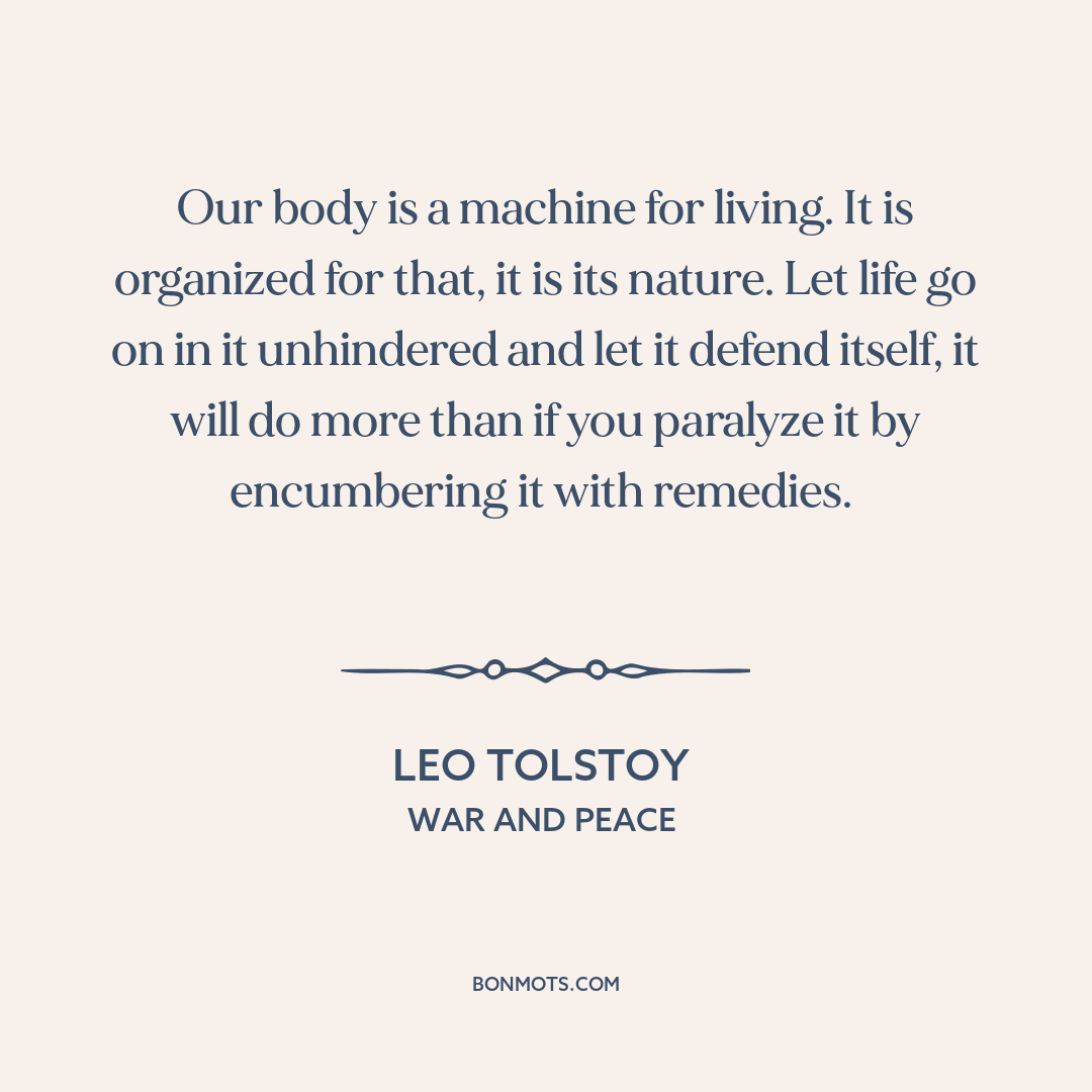 Our body is a machine for living. It is organized for that, it is its nature. Let life go on in it unhindered and let it defend itself, it will do more than if you paralyze it by encumbering it with remedies.