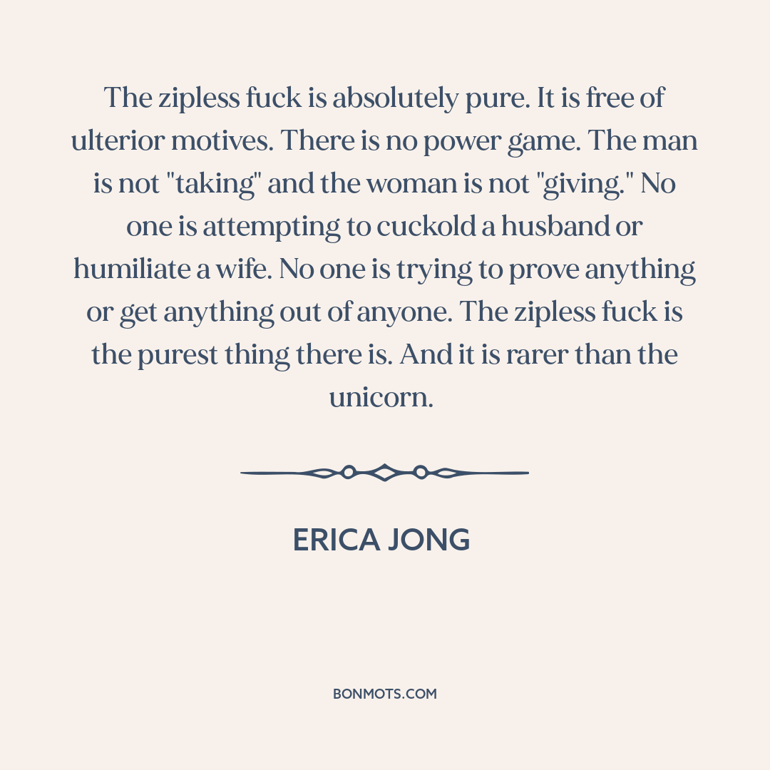 The zipless fuck is absolutely pure. It is free of ulterior motives. There is no power game. The man is not "taking" and the woman is not "giving." No one is attempting to cuckold a husband or humiliate a wife. No one is trying to prove anything or get anything out of anyone. The zipless fuck is the purest thing there is. And it is rarer than the unicorn.