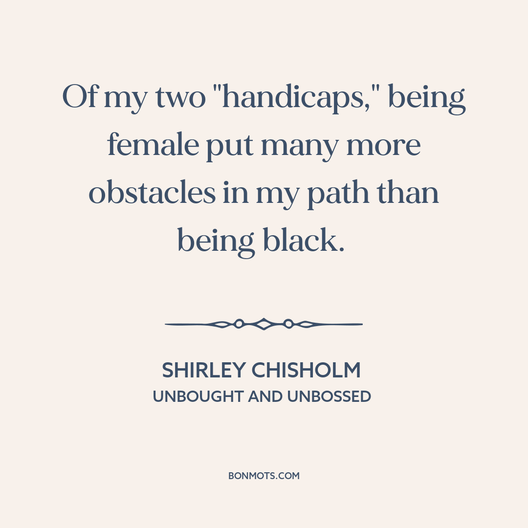 Of my two "handicaps," being female put many more obstacles in my path than being black.