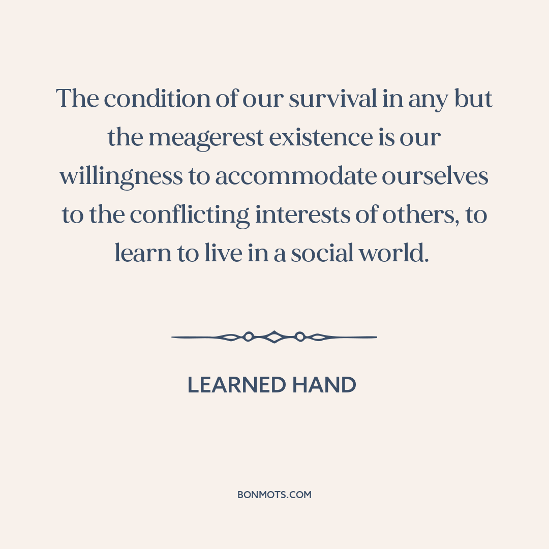 The condition of our survival in any but the meagerest existence is our willingness to accommodate ourselves to the conflicting interests of others, to learn to live in a social world.