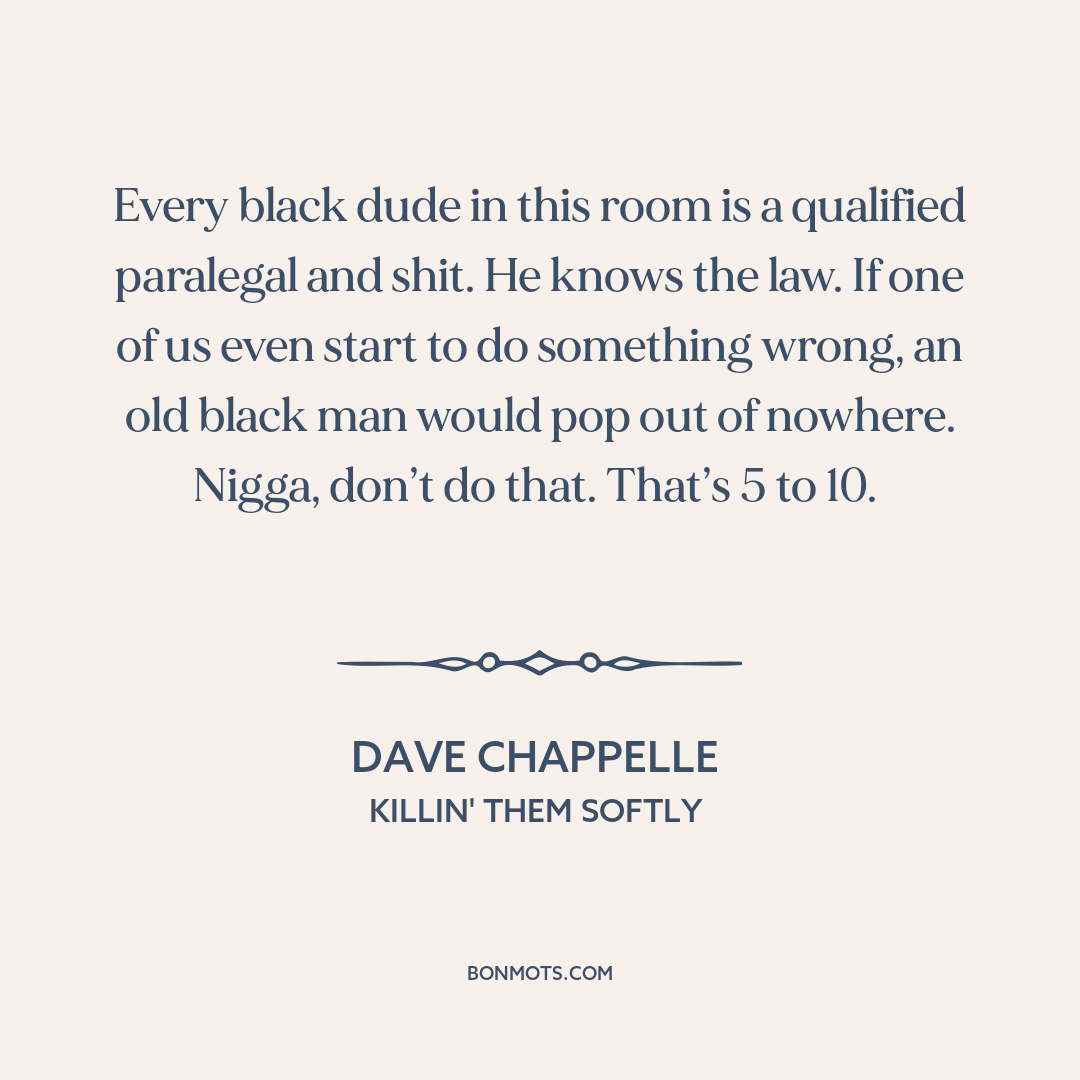Every black dude in this room is a qualified paralegal and shit. He knows the law. If one of us even start to do something wrong, an old black man would pop out of nowhere. Nigga, don’t do that. That’s 5 to 10.