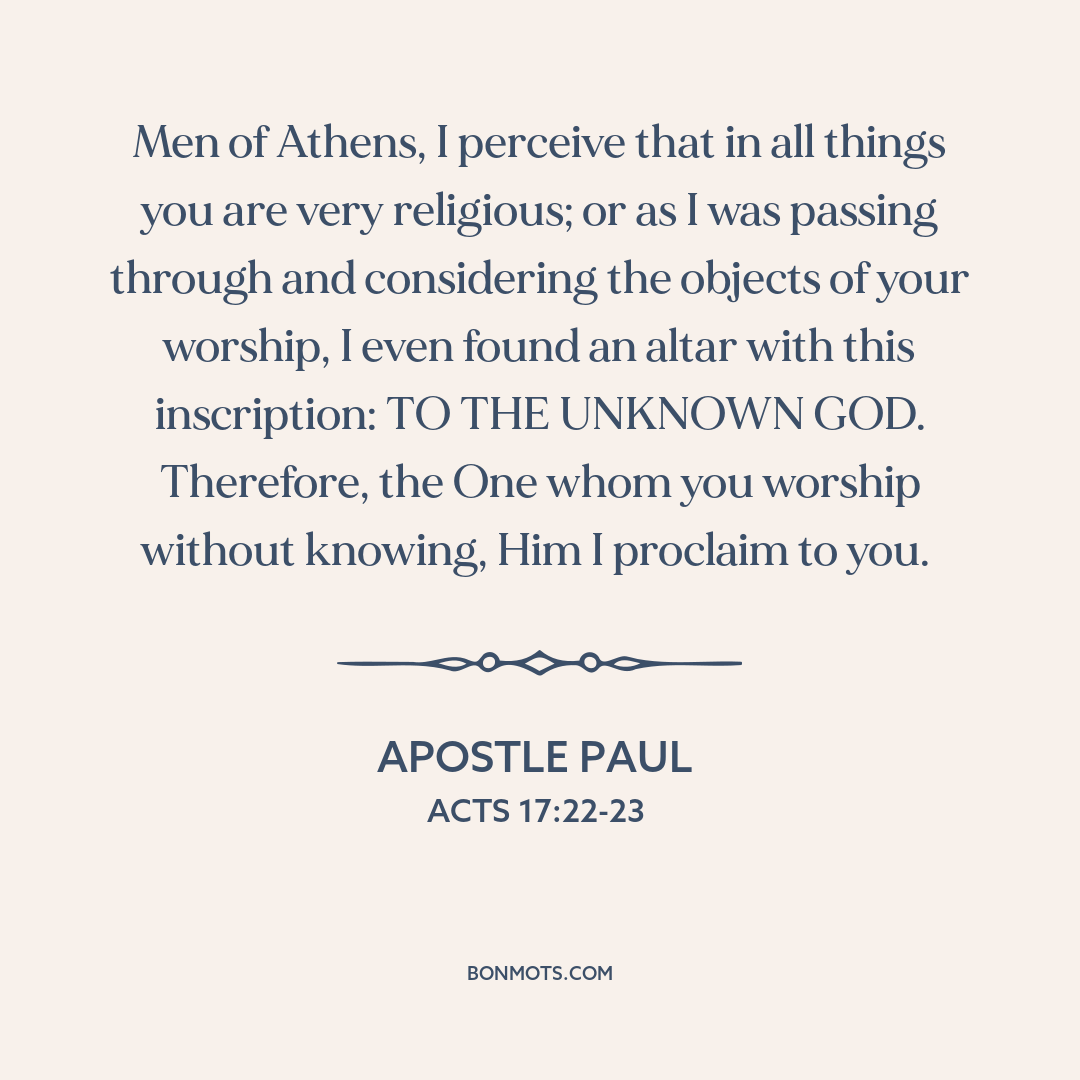 Men of Athens, I perceive that in all things you are very religious; or as I was passing through and considering the objects of your worship, I even found an altar with this inscription: TO THE UNKNOWN GOD. Therefore, the One whom you worship without knowing, Him I proclaim to you.