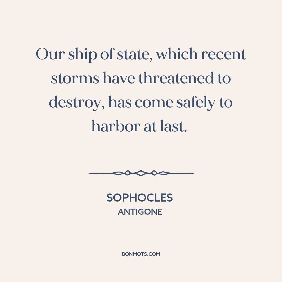 Our ship of state, which recent storms have threatened to destroy, has come safely to harbor at last.