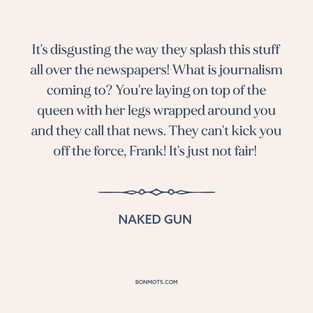 It's disgusting the way they splash this stuff all over the newspapers! What is journalism coming to? You're laying on top of the queen with her legs wrapped around you and they call that news. They can't kick you off the force, Frank! It's just not fair!