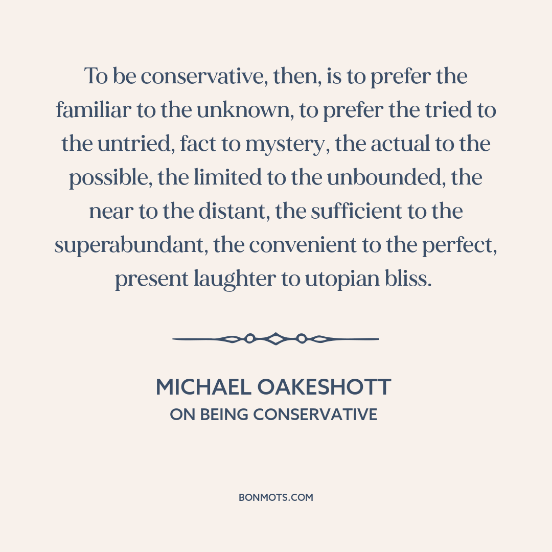 To be conservative, then, is to prefer the familiar to the unknown, to prefer the tried to the untried, fact to mystery, the actual to the possible, the limited to the unbounded, the near to the distant, the sufficient to the superabundant, the convenient to the perfect, present laughter to utopian bliss.