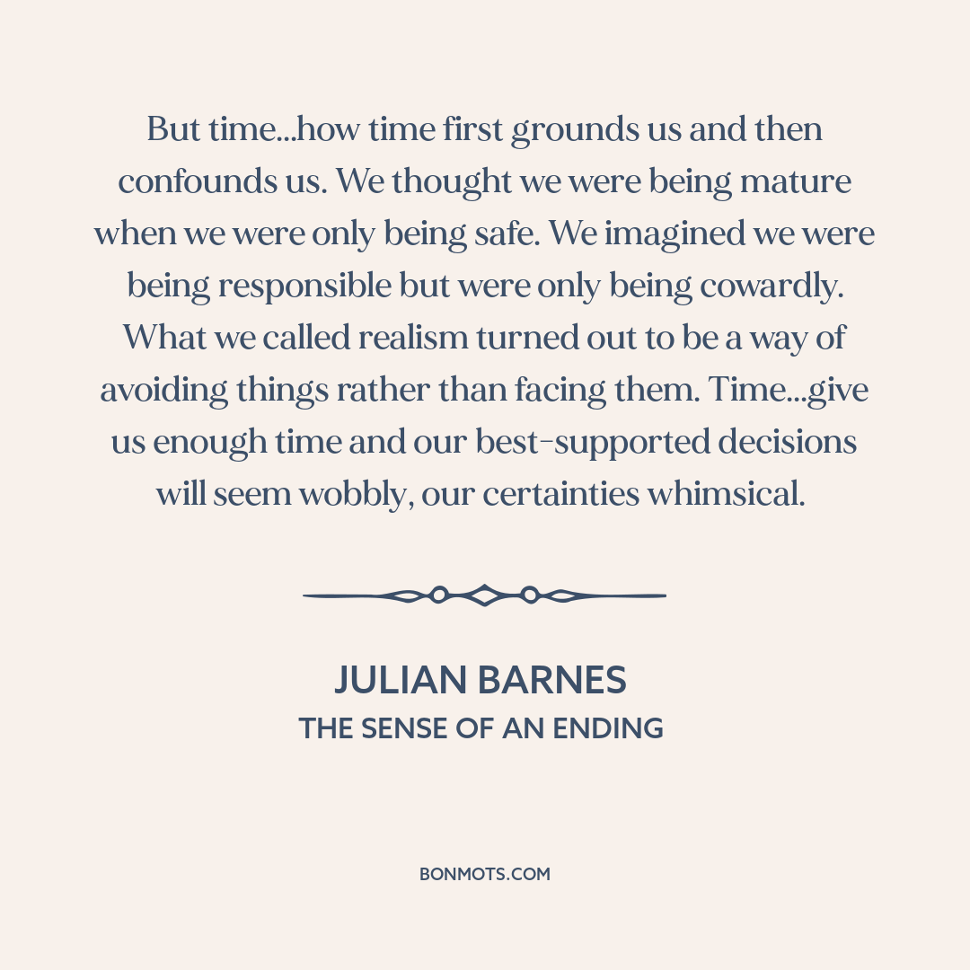 But time...how time first grounds us and then confounds us. We thought we were being mature when we were only being safe. We imagined we were being responsible but were only being cowardly. What we called realism turned out to be a way of avoiding things rather than facing them. Time...give us enough time and our best-supported decisions will seem wobbly, our certainties whimsical.